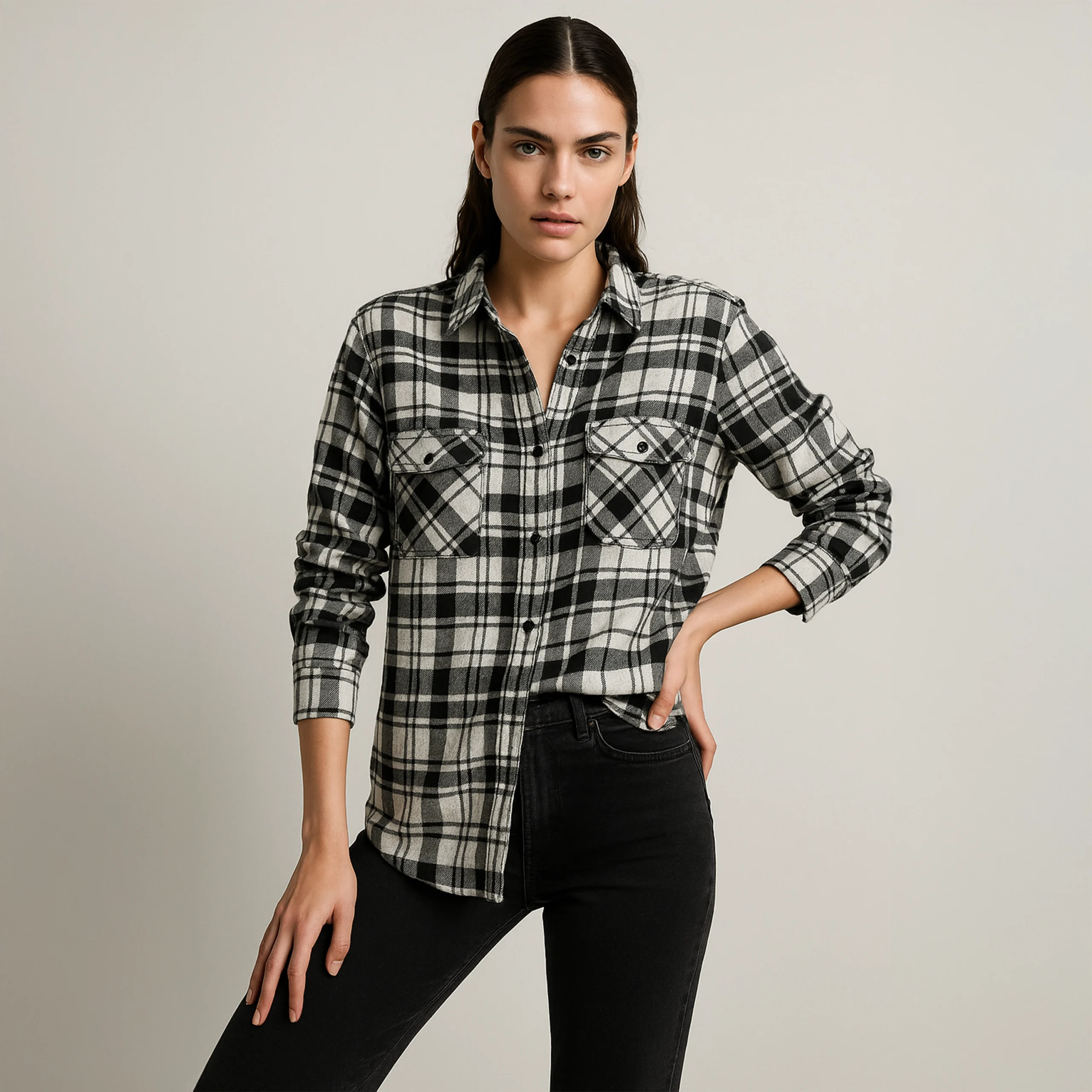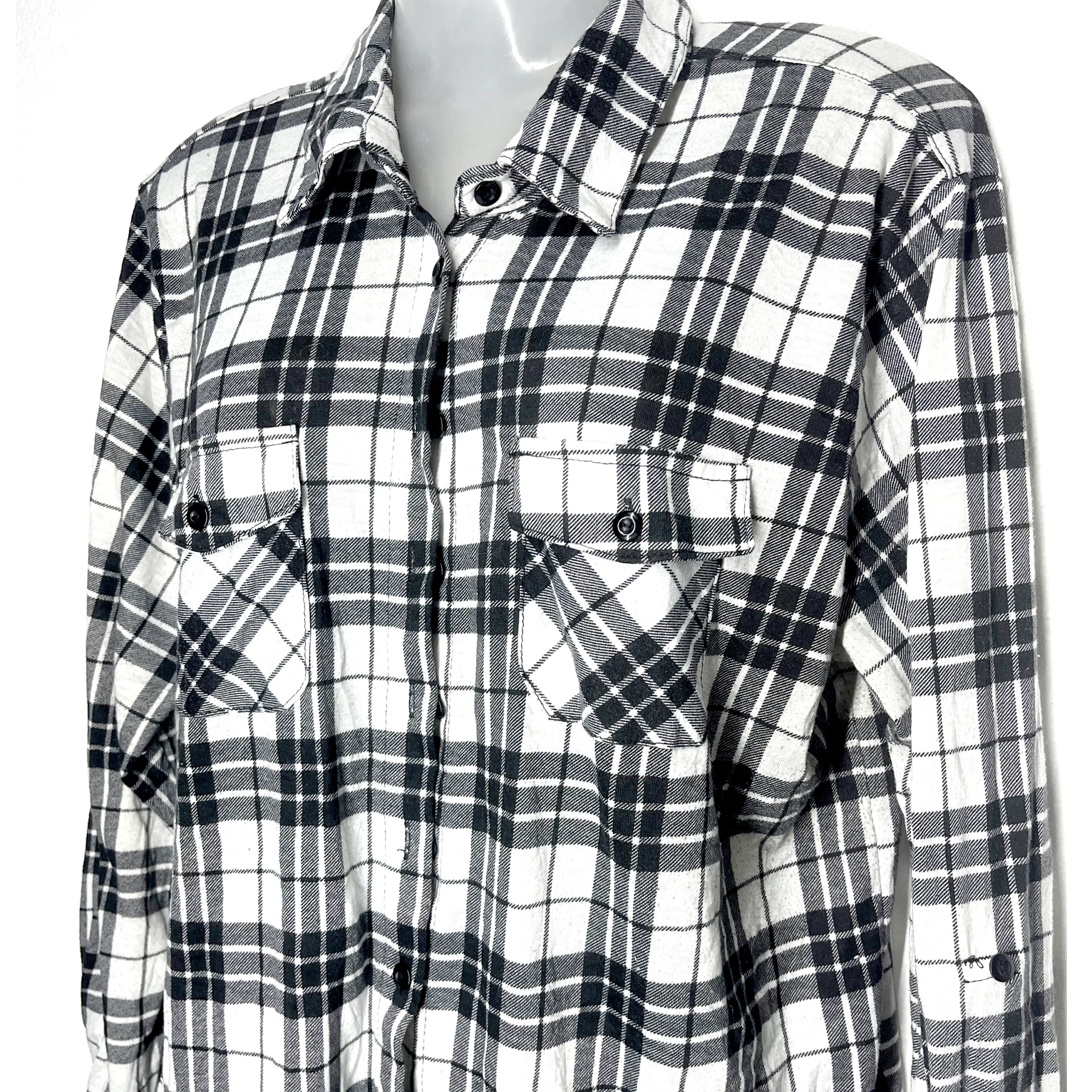 Timeless and bold. The Plaid Classic Shirt features a striking black-and-white plaid pattern and a classic collar that adds just the right touch of detail. Its relaxed fit flows beautifully with every move, offering comfort without compromising on style. Pair it with jeans for a casual day out or layer it under a sweater for a cozy fall look — it’s versatile, timeless, and endlessly re-wearable. Sourced for Rewind Thrifts, this pre-loved piece is in excellent condition, ready to bring a rugged elegance to your wardrobe. A wardrobe essential for any season!