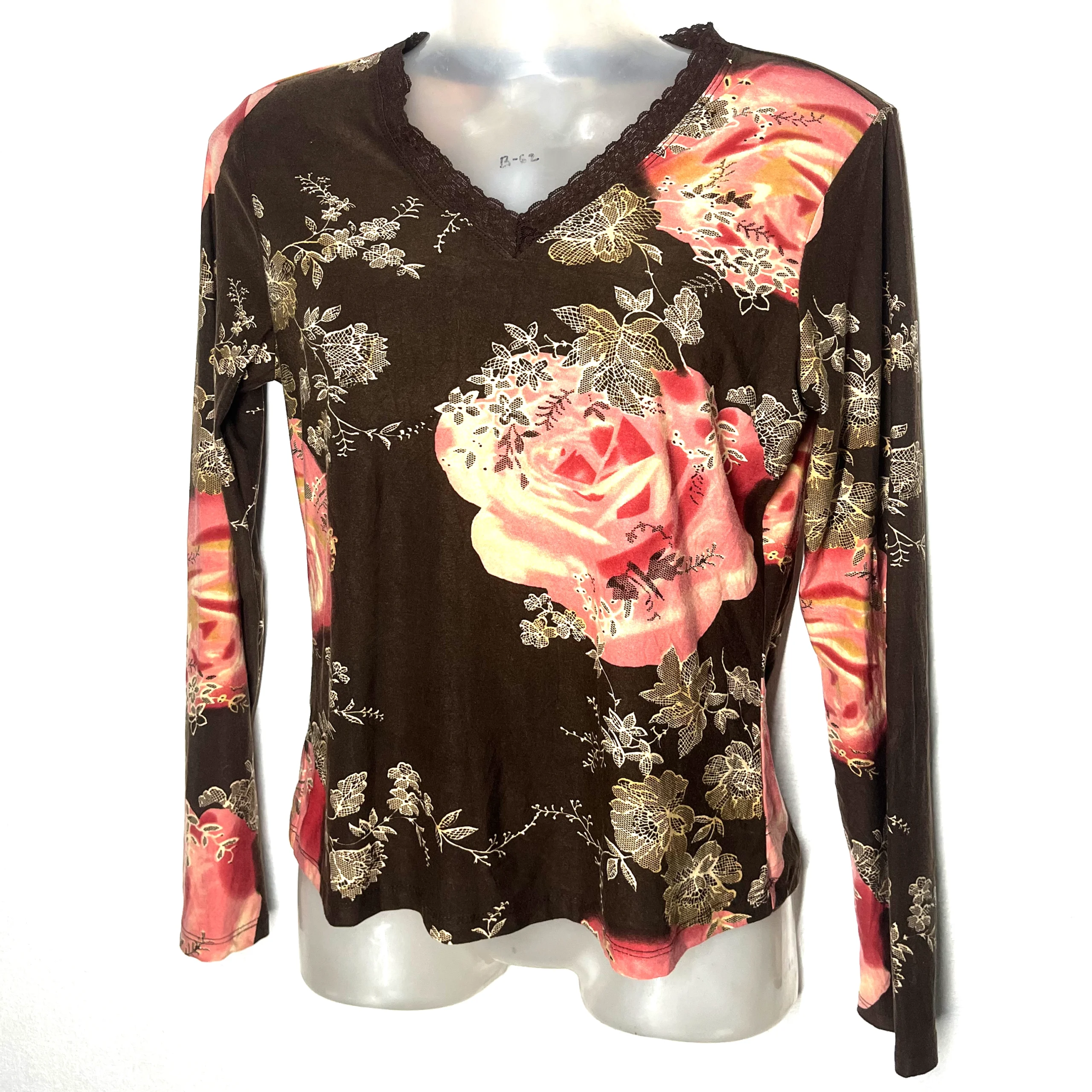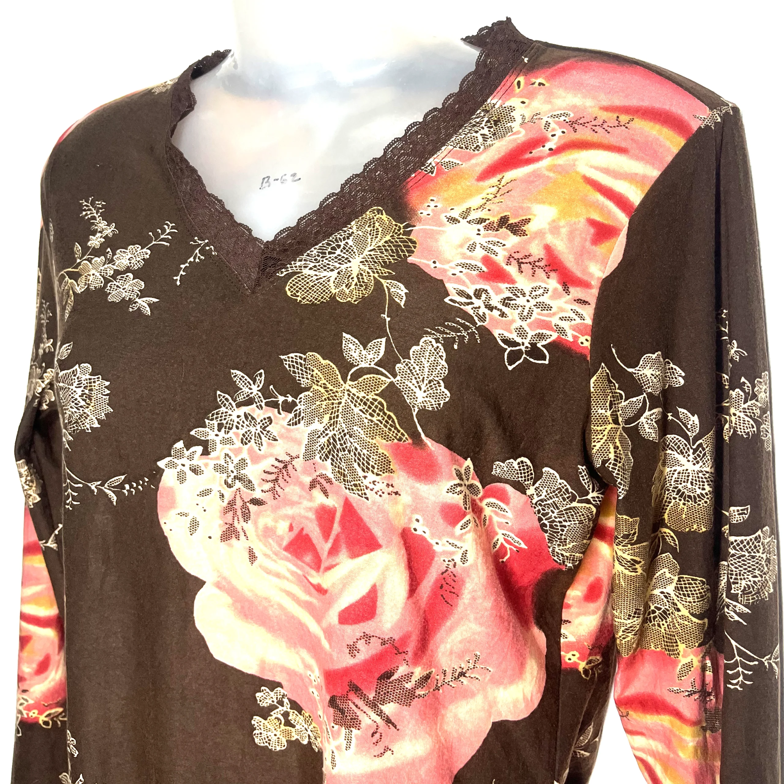 Bring a touch of vintage romance to your wardrobe with the Vintage Bloom Lace Top. Crafted from soft, stretch-kissed fabric, this piece showcases bold pink and coral rose prints against a rich brown background. The V-neckline is trimmed with delicate lace, adding just the right amount of old-world charm. Long sleeves and a flattering silhouette make it ideal for year-round wear, whether you’re dressing it up with skirts or keeping it casual with denim.