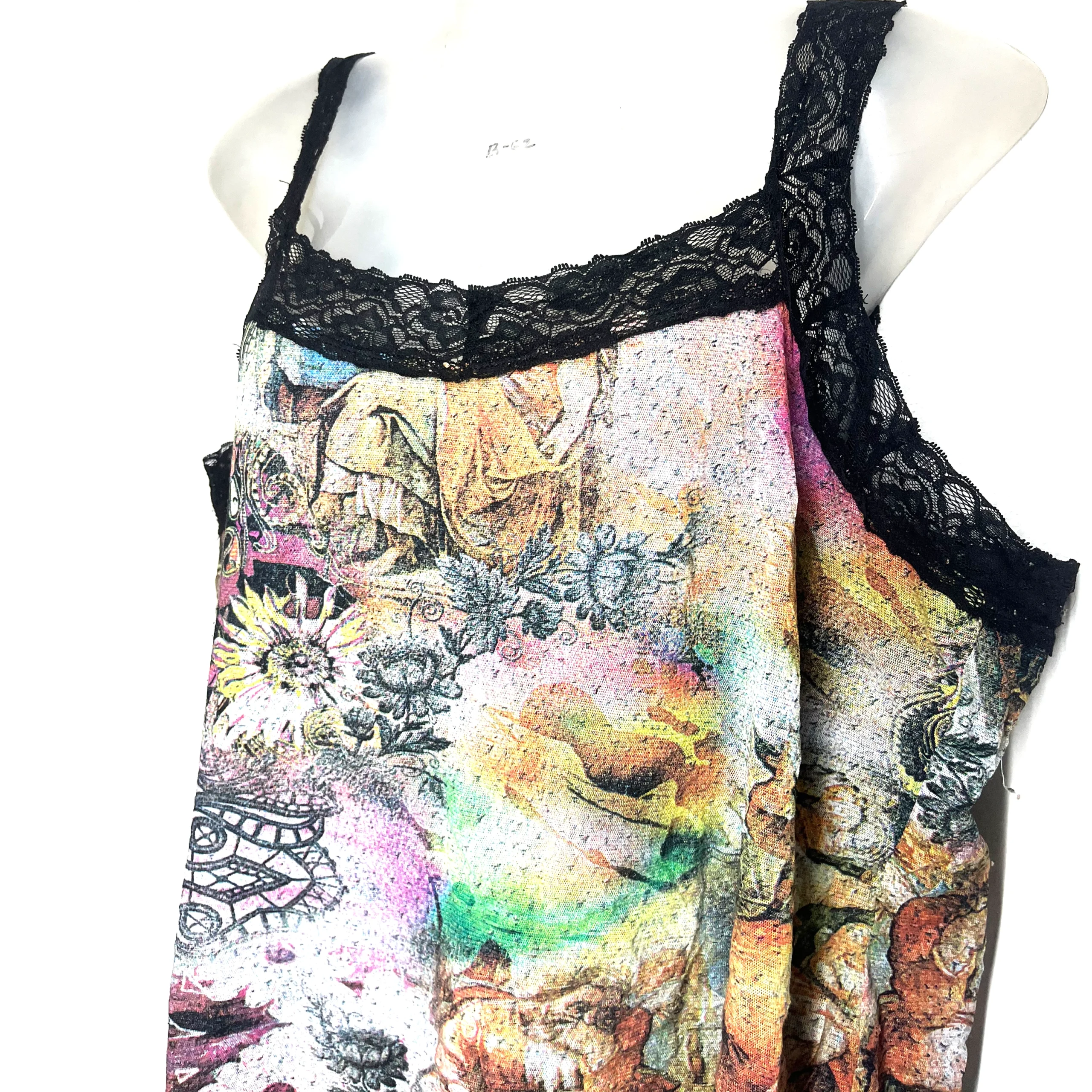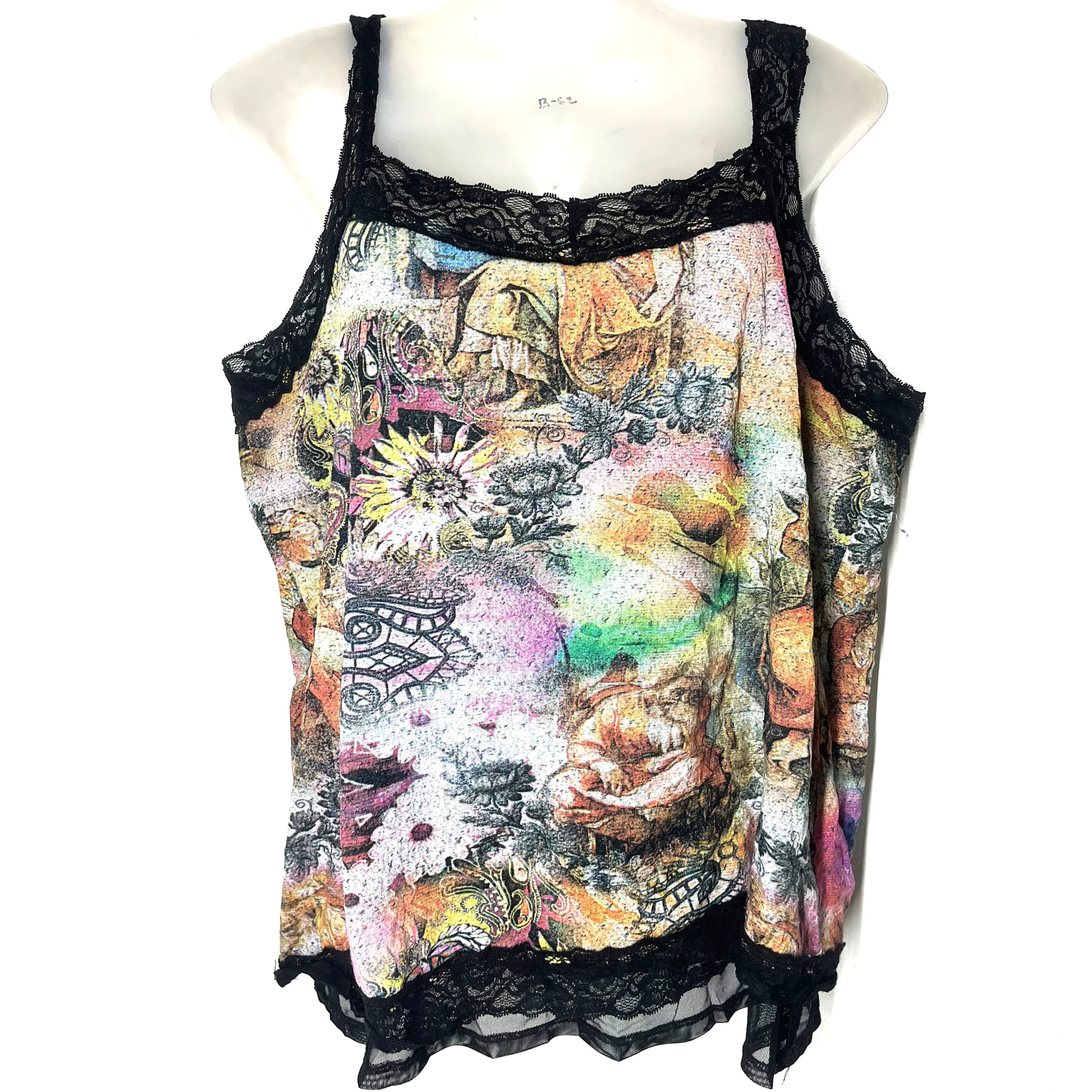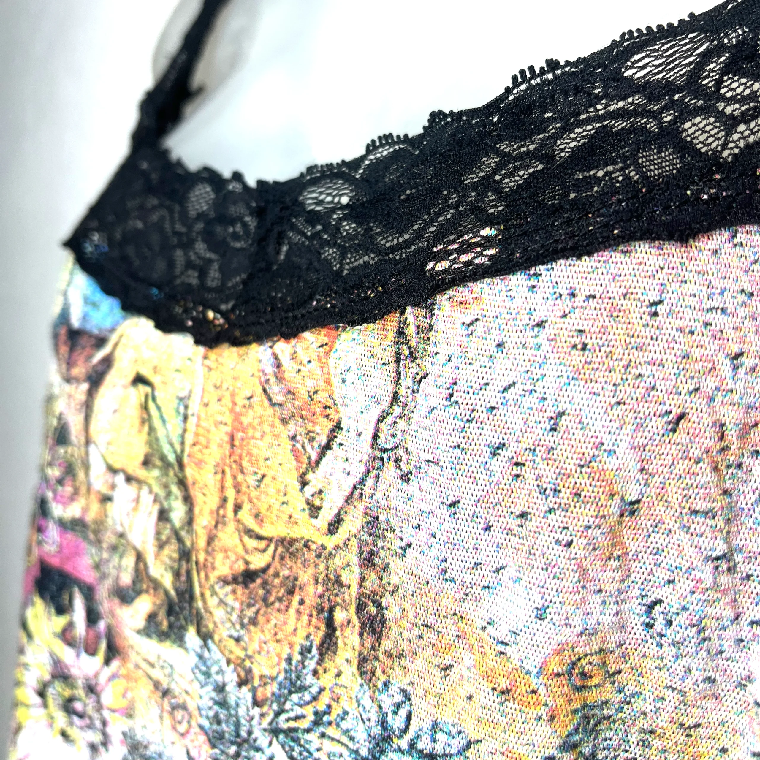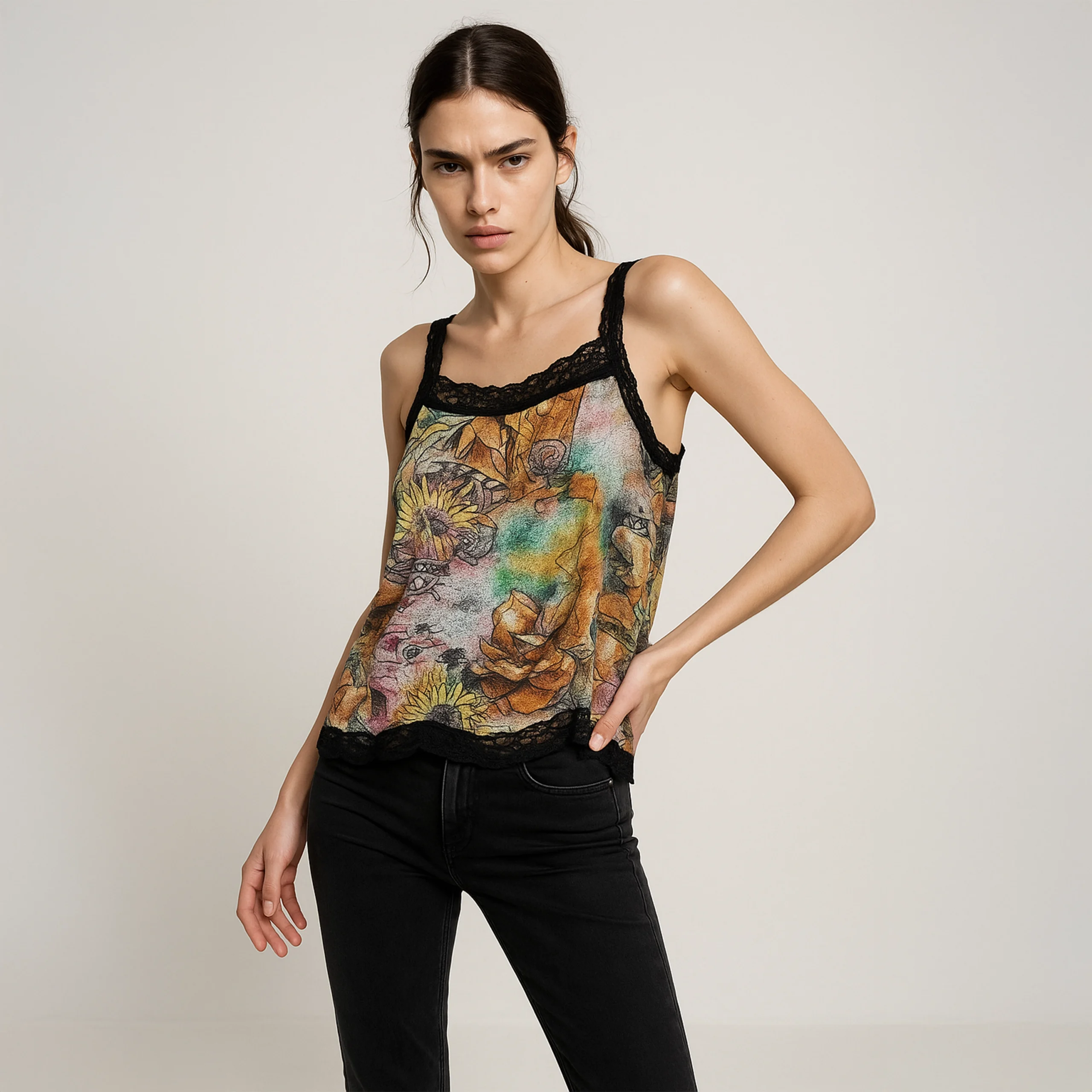 Crafted with a lightweight fabric, this cami flaunts an artistic floral print in earthy tones, framed with black lace on the neckline and straps for that perfect retro finish. Pair it with your favorite high-rise jeans, skirts, or even layer it under jackets for a laid-back yet elevated vibe. One-of-a-kind piece, just like you.