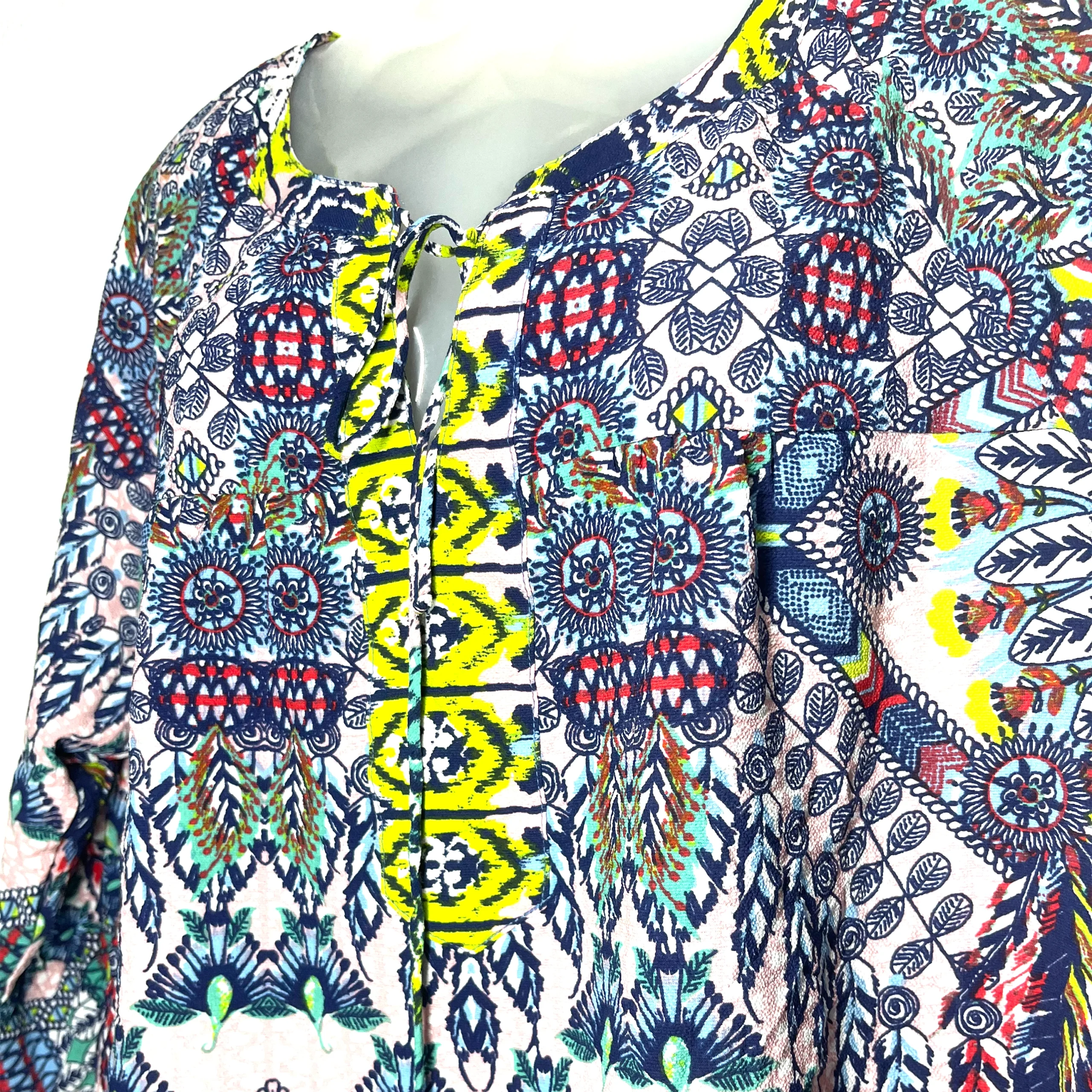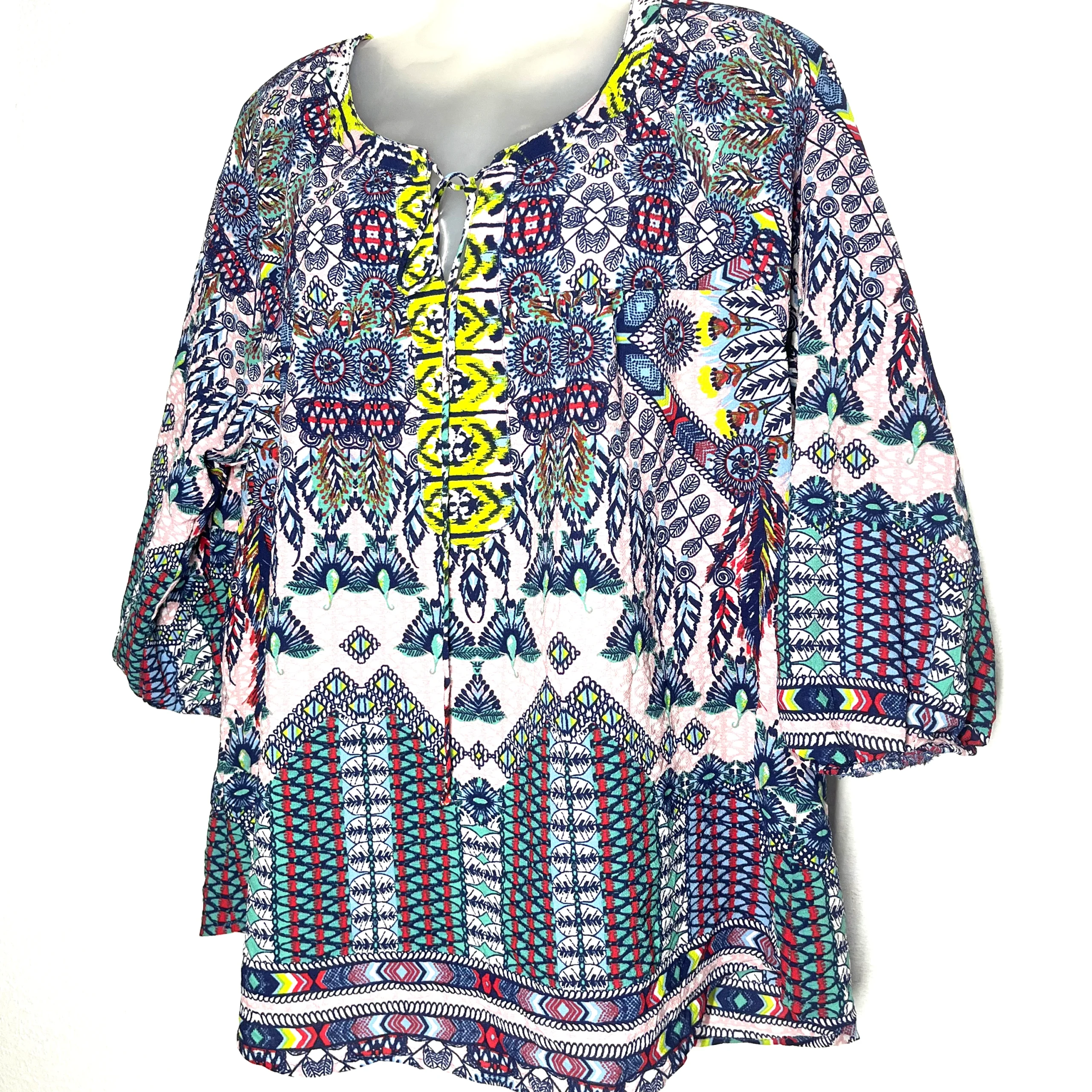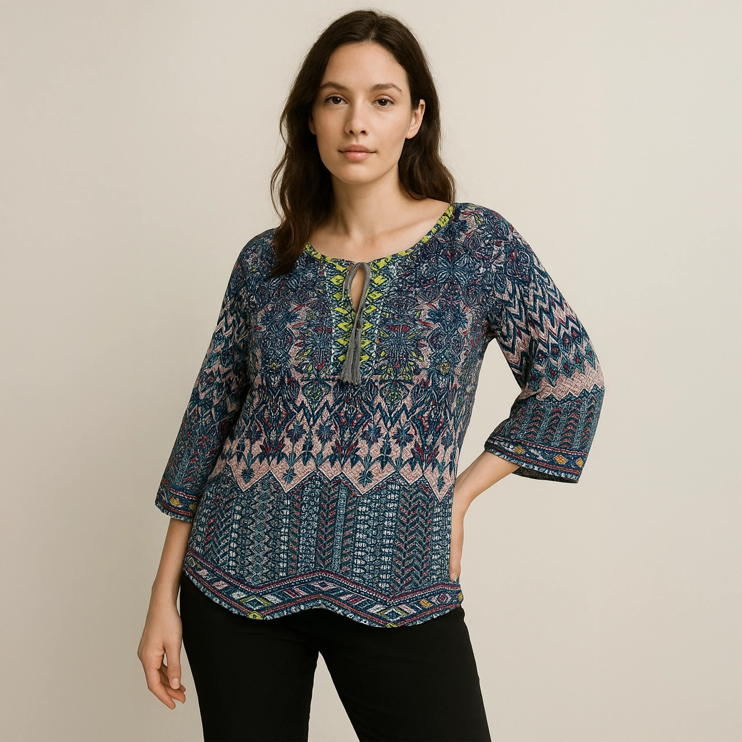Designed with intricate patterns and a charming keyhole tie-up neckline, this top brings a touch of wanderlust to your everyday wardrobe.