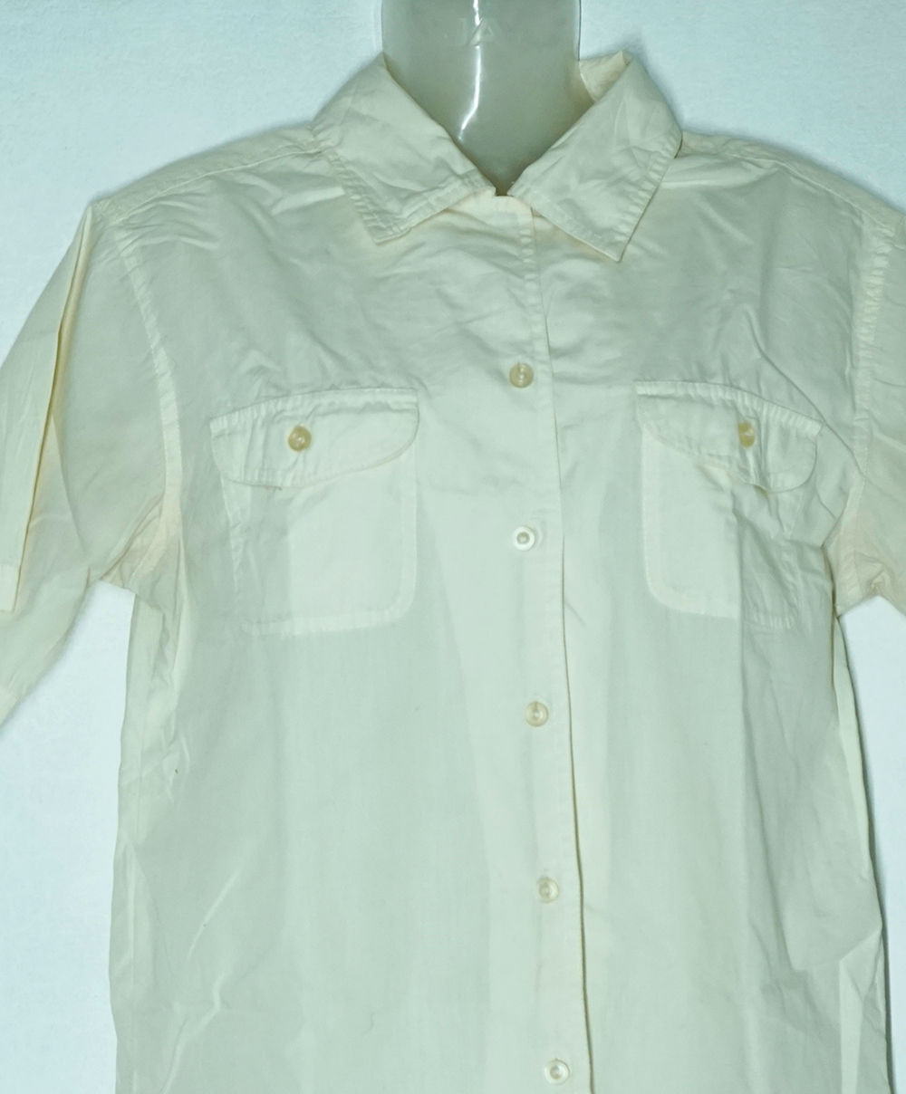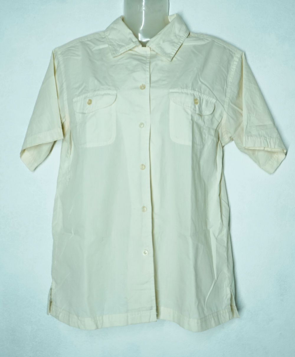 A vintage Bobbie Brooks cream short-sleeve shirt featuring a structured yet relaxed fit, button-down front, and dual pockets. Perfect for effortless casual styling or layering for a thrift-chic aesthetic.