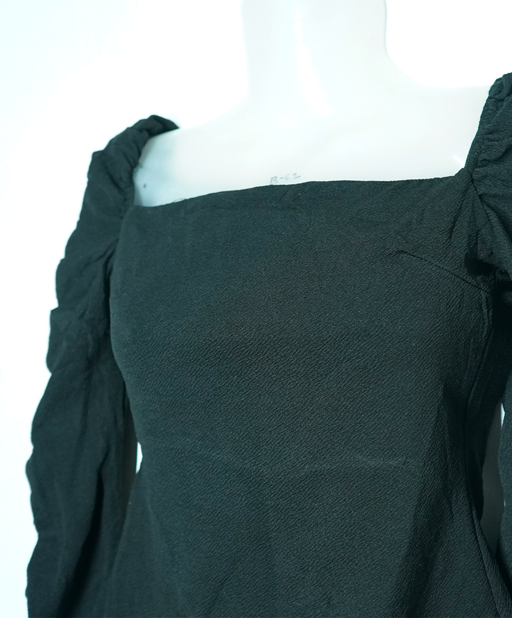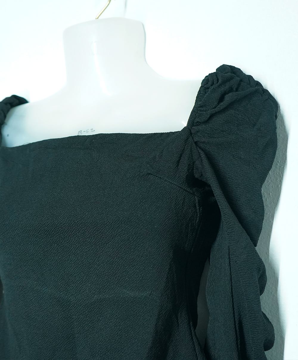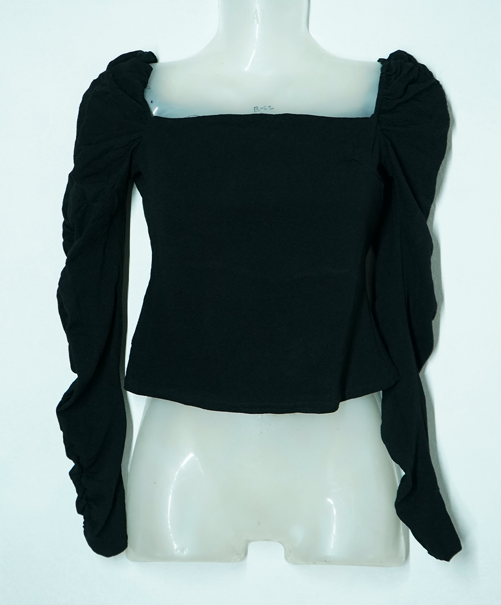 Crafted from premium textured fabric, this top features a chic square neckline and dramatic ruched sleeves that exude effortless sophistication.