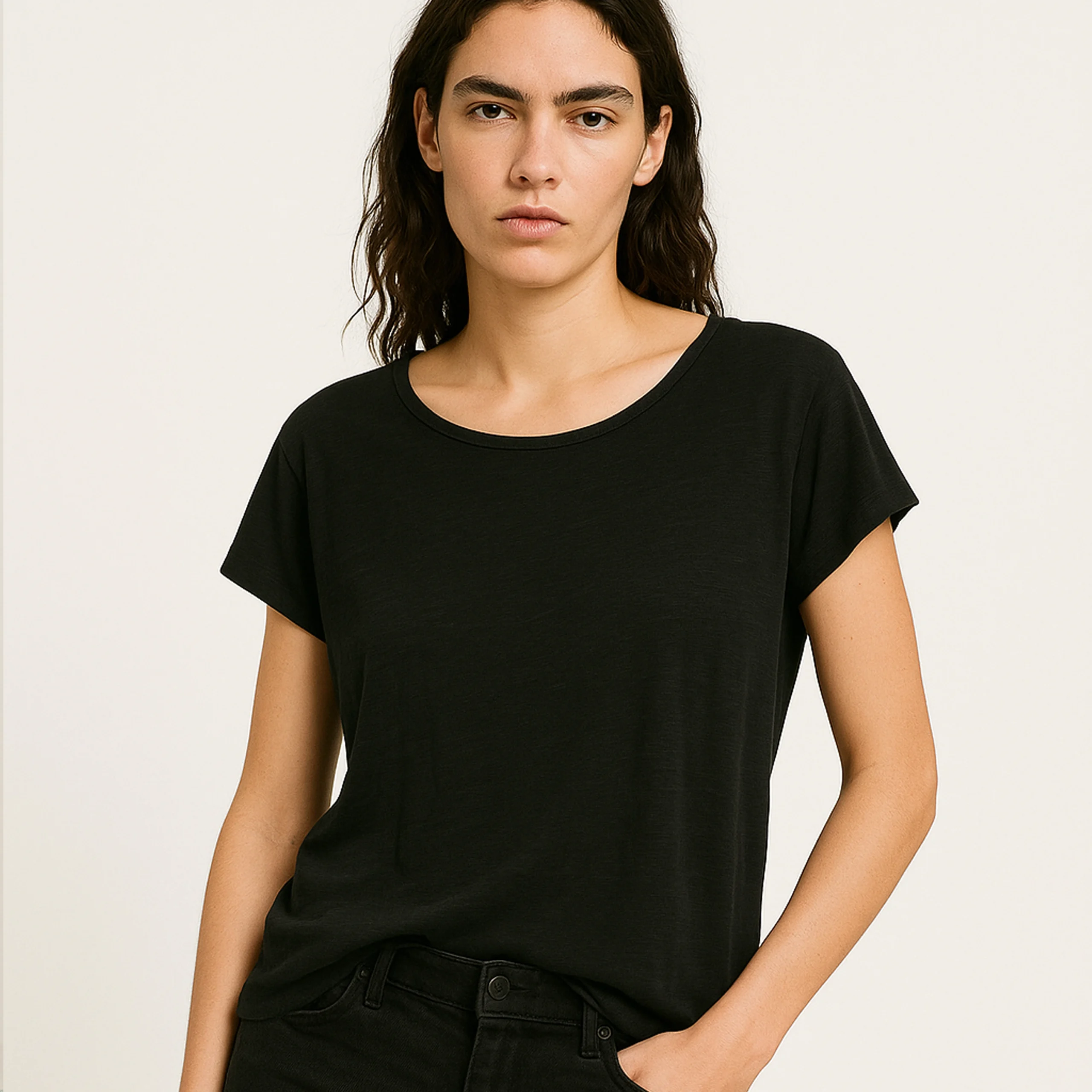 The soft black fabric enhances comfort, while the slightly curved hem adds a stylish touch. Dress it up or down – it’s a piece you’ll reach for again and again!