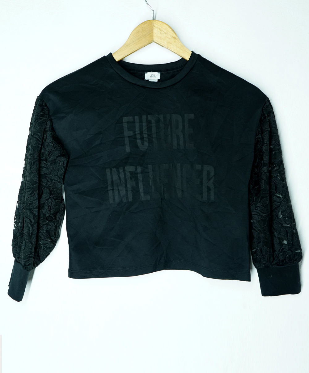 Step into the spotlight with our Future Influencer Black Lace-Sleeve Crop Top, a premium thrifted find from Rewind Thrifts.