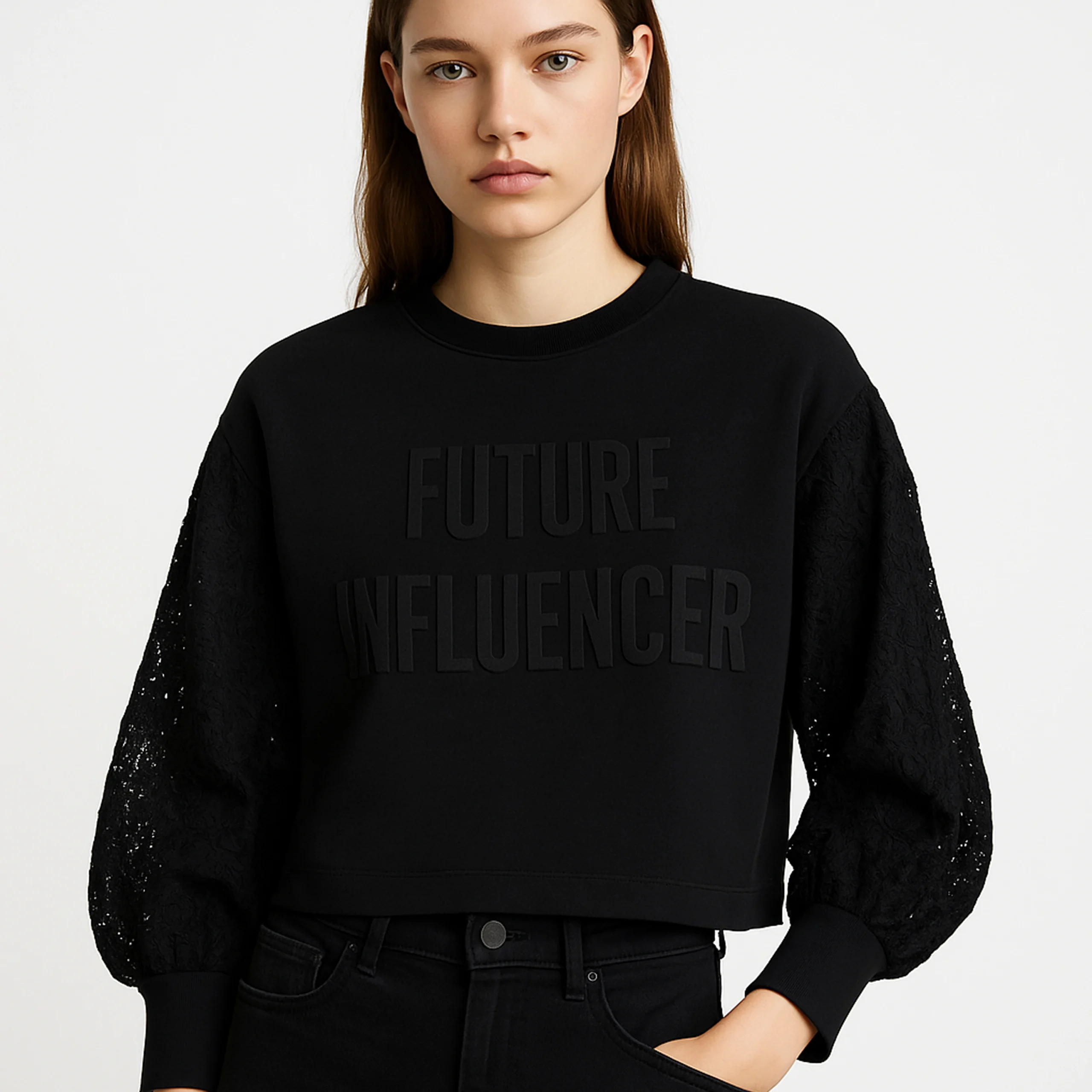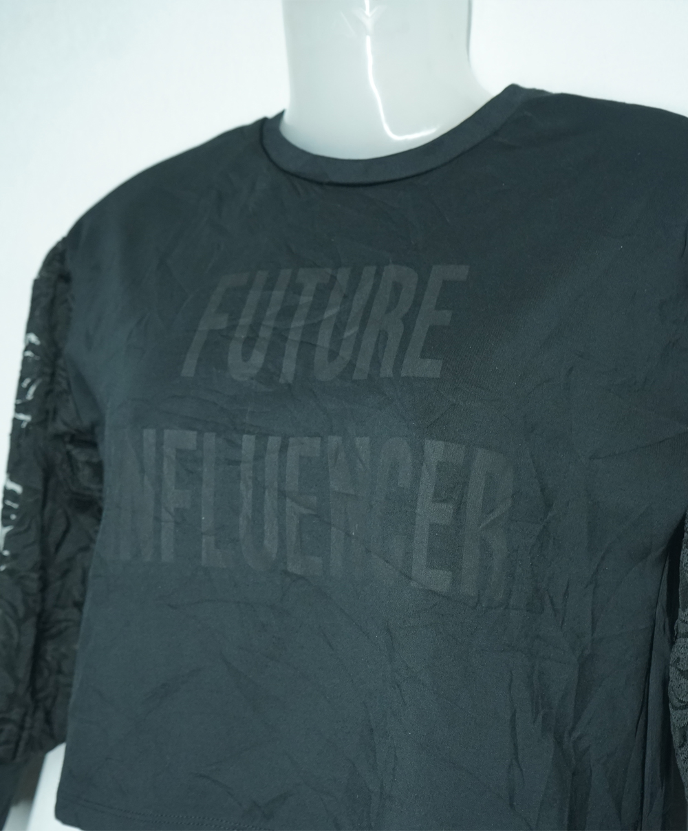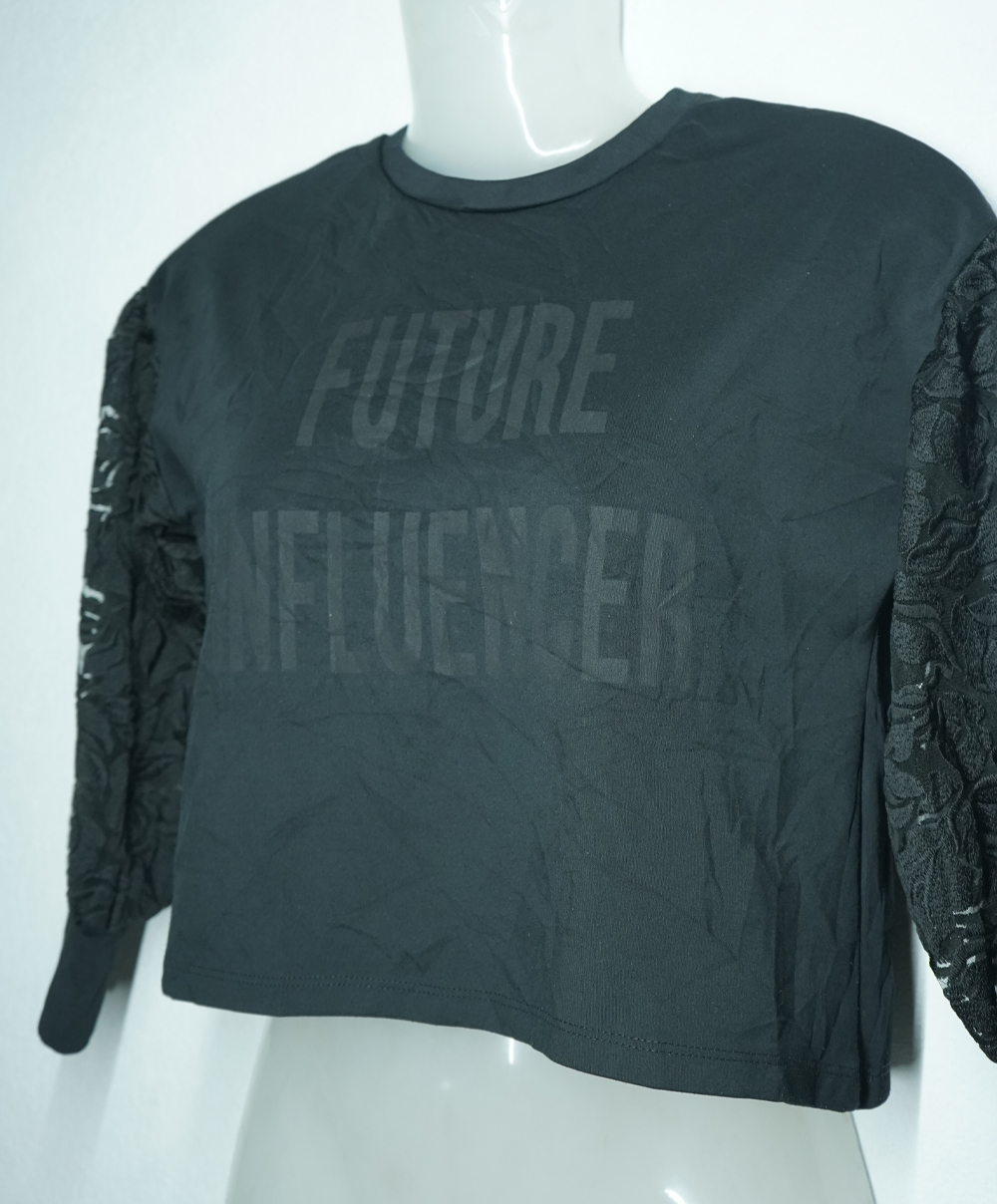 Unleash your bold side with this statement crop top! Featuring “Future Influencer” in a sleek tonal print, luxe lace puffed sleeves, and a classic round neckline, this thrifted piece is a must-have for your edgy wardrobe.