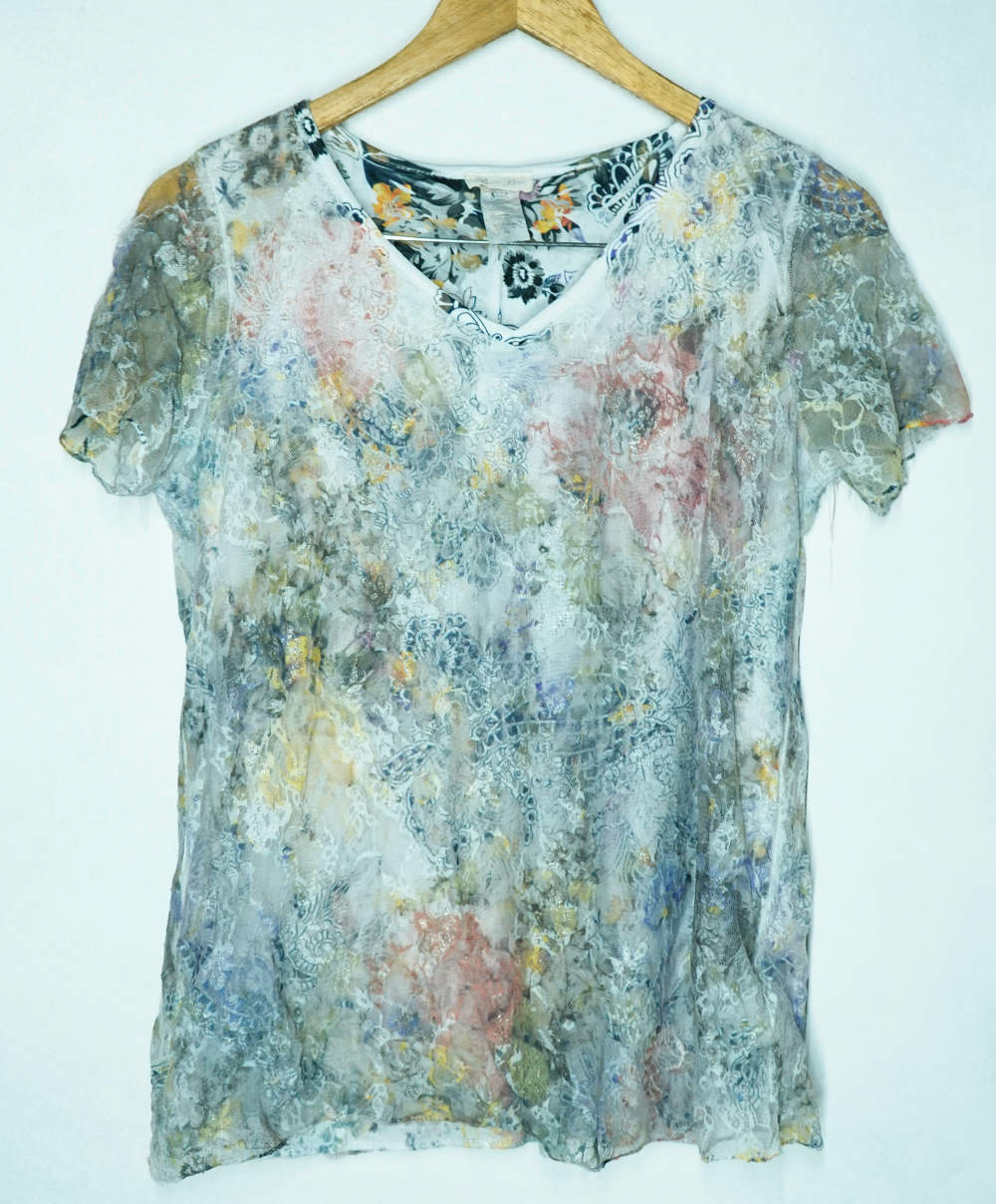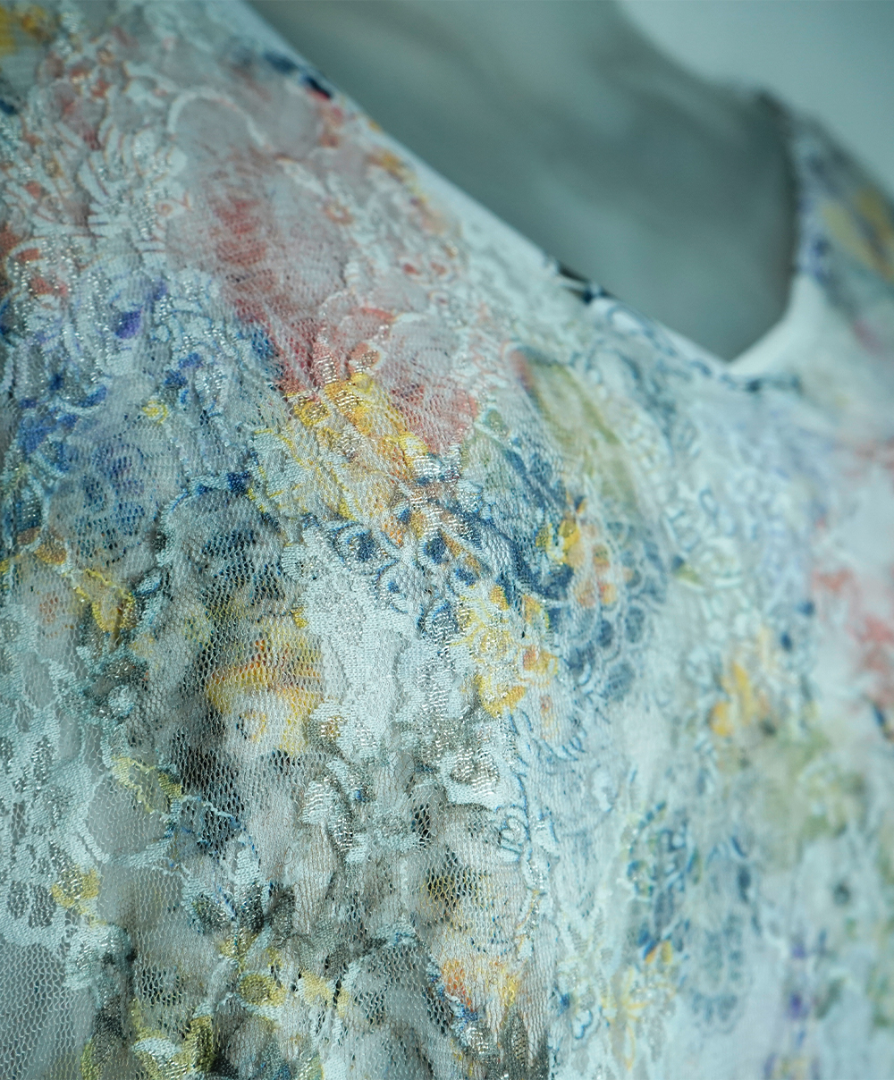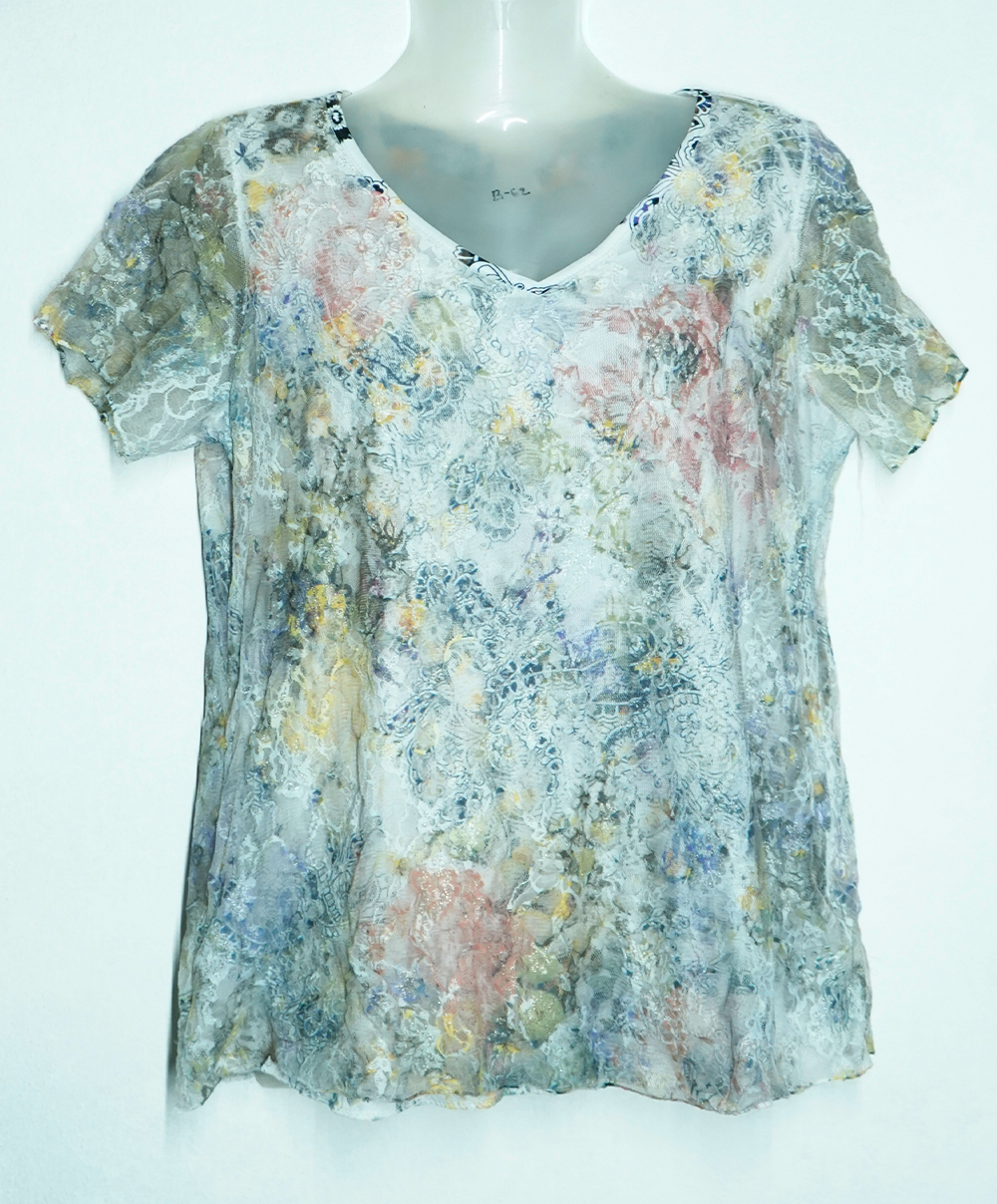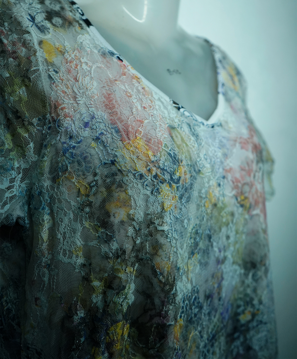 Featuring a delicate lace outer layer with a soft floral-printed lining, this top offers a dreamy, ethereal look.