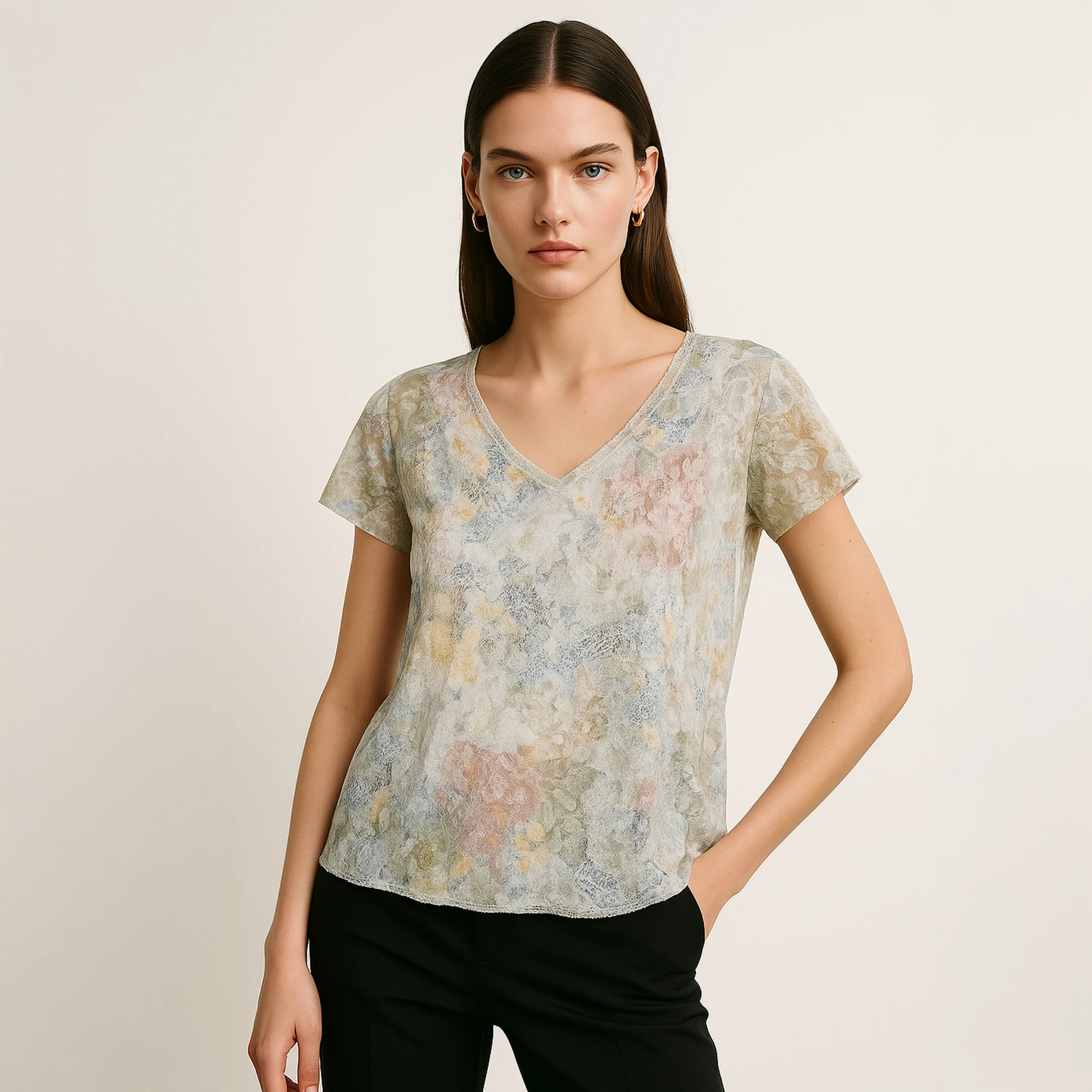 The V-neckline and short sleeves add to its effortless charm.